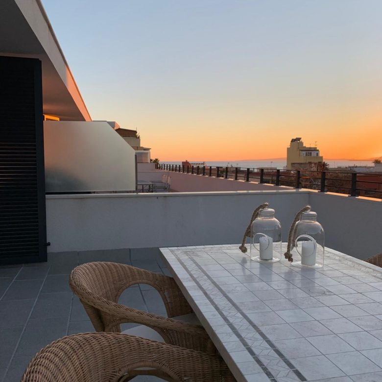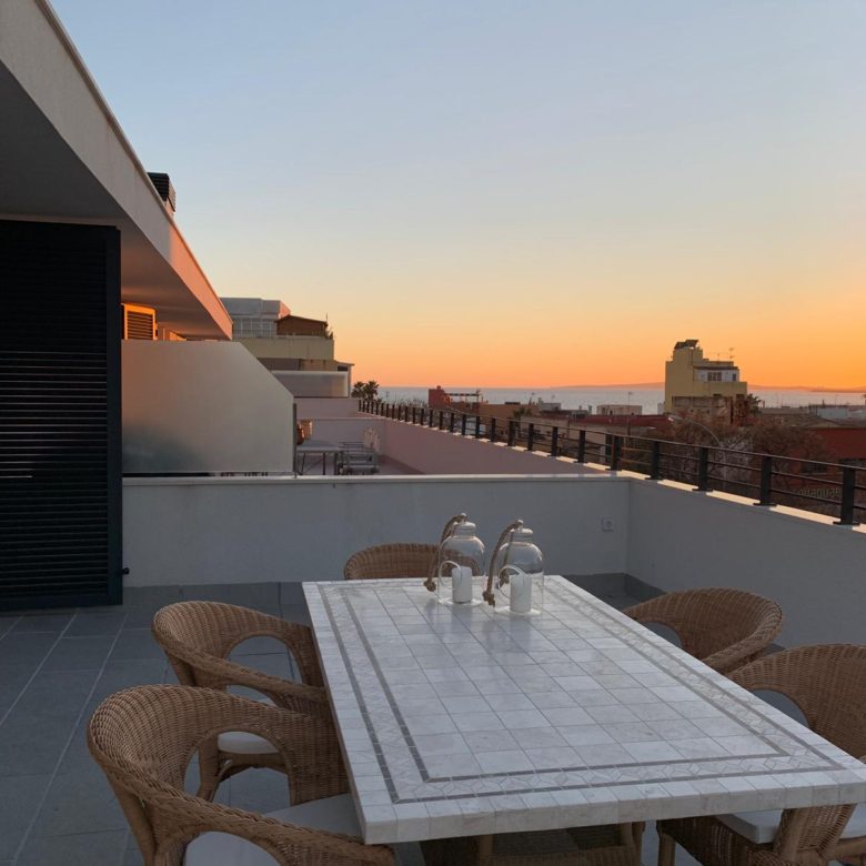 The terrace extends around the corner of the penthouse, capturing both morning and afternoon sun and ensuring natural light throughout the day. South-facing sea views meet open skies and distant mountain backdrops, creating a seamless indoor-outdoor Mediterranean living experience.