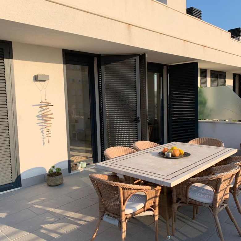Built in 2018 in a clean minimalist style, the apartment features floor-to-ceiling glass doors that connect seamlessly to the terrace.