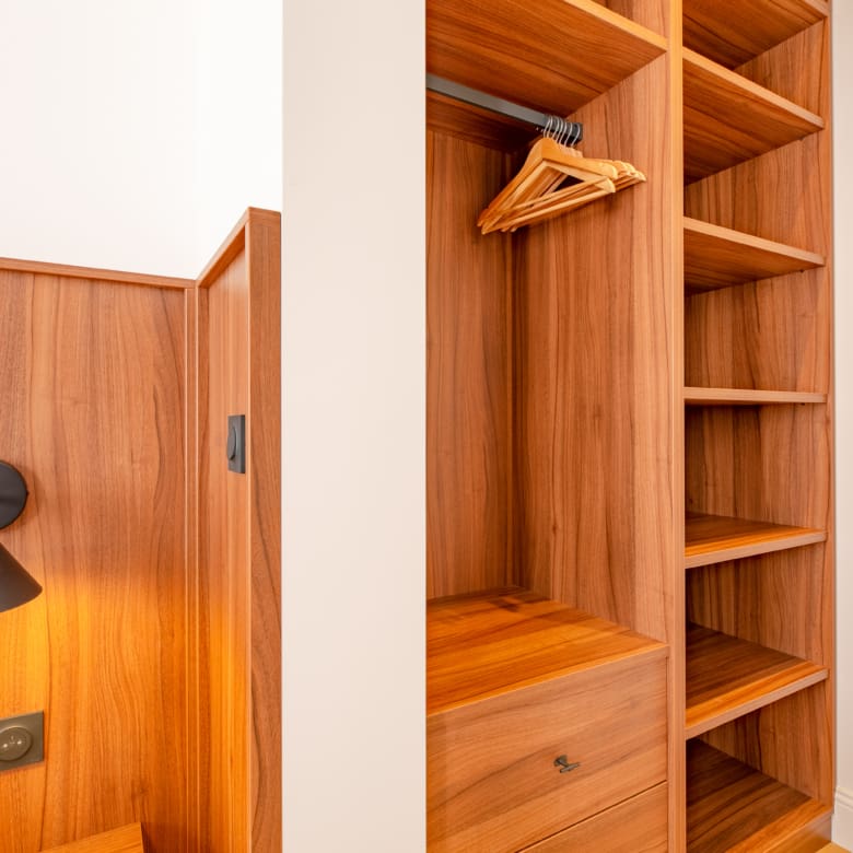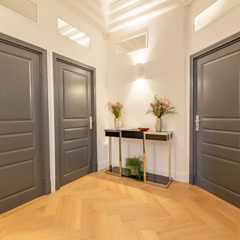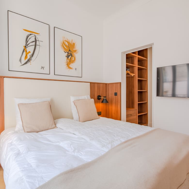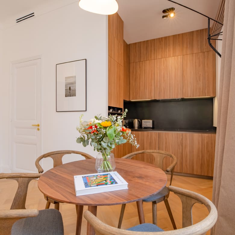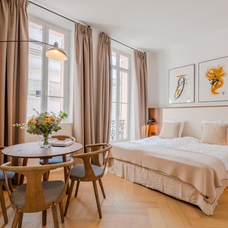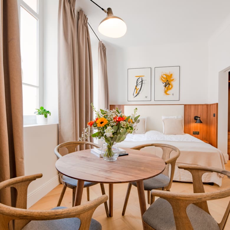Renovated in 2024 by the acclaimed M-P Design, this luxury studio blends modern Scandinavian elegance with the feel of a 5-star boutique suite. High ceilings, large windows, walk-in closet and a clever layout make this 28 m² apartment feel spacious and functional – perfect for short-term rental guests.