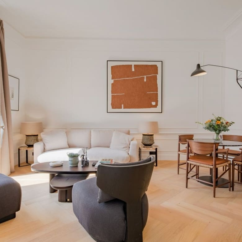 Renovated in 2024 by the acclaimed M-P Design, this luxury studio blends modern Scandinavian elegance with the feel of a 5-star boutique suite. High ceilings, large windows, and a clever layout make this 49 m² apartment feel spacious and functional and in addition provides two balconies;- one southwest facing with access from bedroom – the other south facing, directly accessible from balcony the living room – just perfect for short-term rental guests, who loves the sun and luxury comfort.