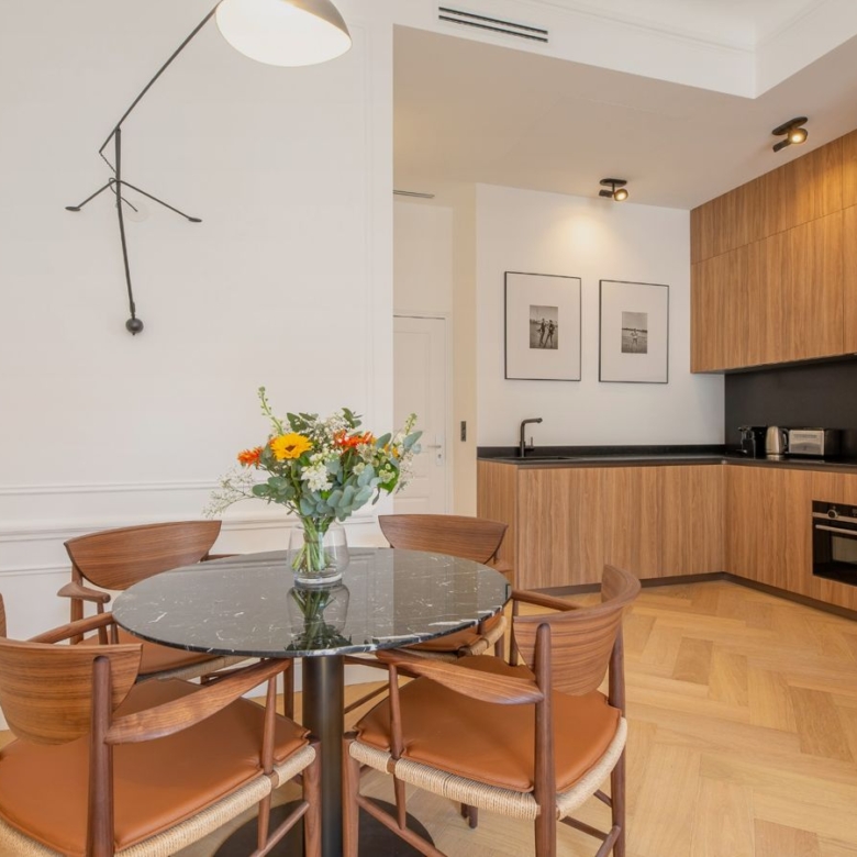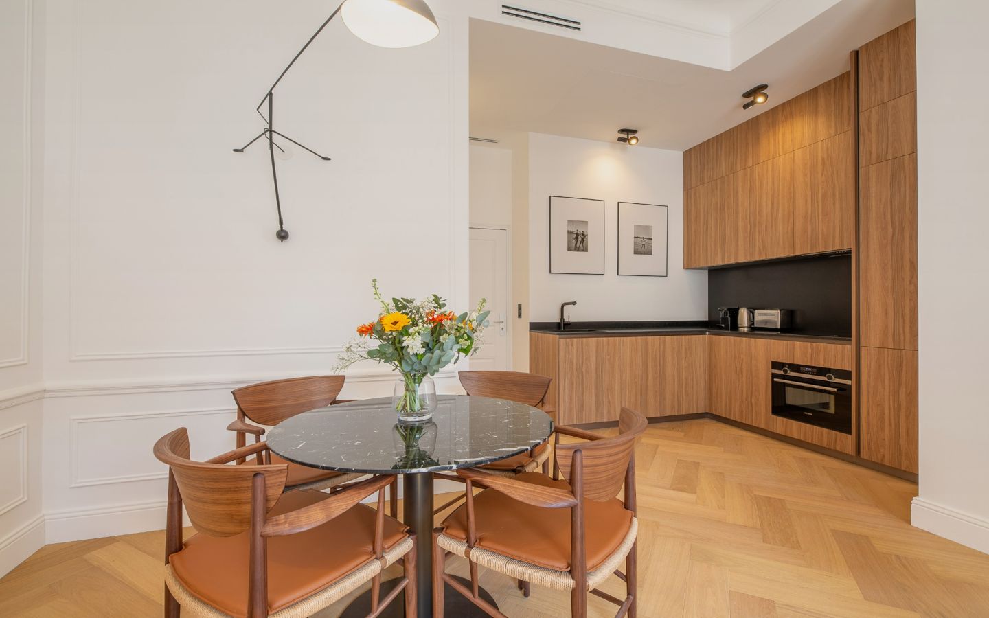 Renovated in 2024 by the acclaimed M-P Design, this luxury studio blends modern Scandinavian elegance with the feel of a 5-star boutique suite. High ceilings, large windows, and a clever layout make this 49 m² apartment feel spacious and functional and in addition provides two balconies;- one southwest facing with access from bedroom – the other south facing, directly accessible from  balcony the living room  – just perfect for short-term rental guests, who loves the sun and luxury comfort.