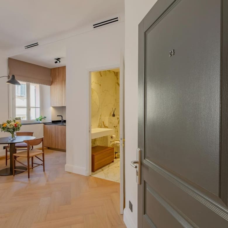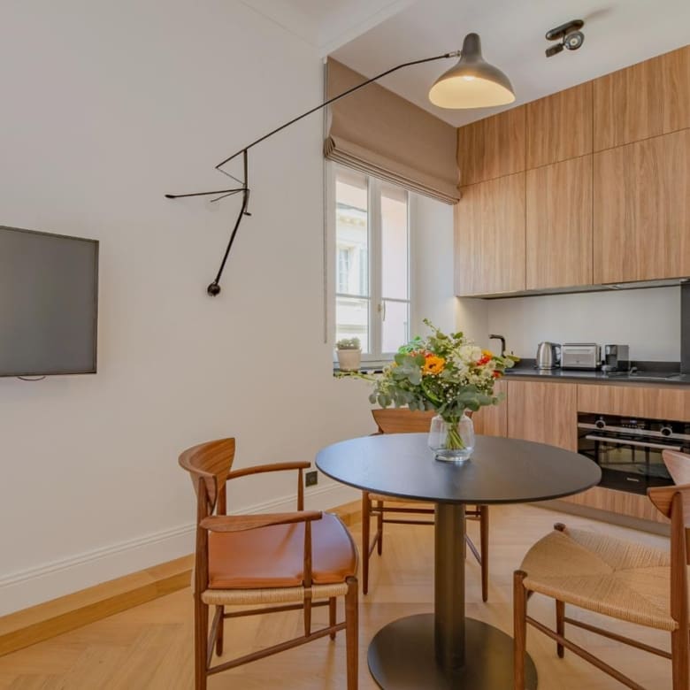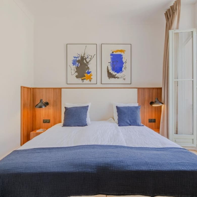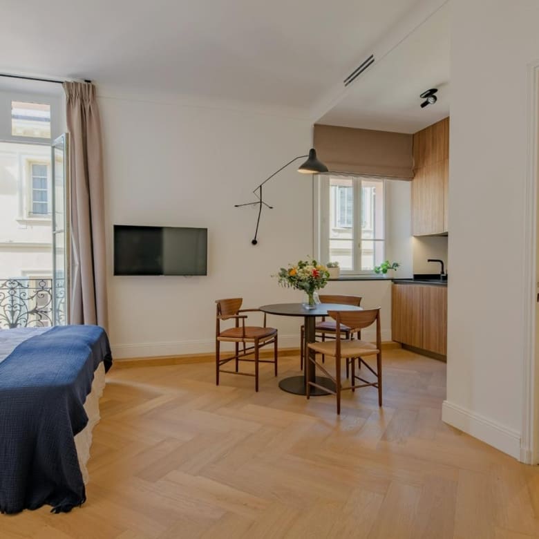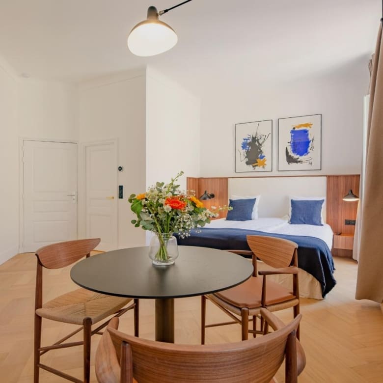 Renovated in 2024 by the acclaimed M-P Design, this luxury studio blends modern Scandinavian elegance with the feel of a 5-star boutique suite. High ceilings, large windows, walk-in closet and a clever layout make this 29 m² apartment feel spacious and functional – just perfect for short-term rental guests.